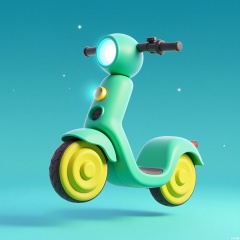 A 3D-rendered cartoon electric scooter with a mint-green frame, neon-yellow wheels, and a glowing battery indicator on the handlebar. It leans into a turn, leaving a trail of cyan sparkles. The background is a sky-blue solid, suggesting urban mobility.