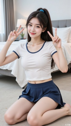 The image shows a young woman sitting on the floor in a bedroom. She is wearing a white short-sleeved top with blue trim and a blue pleated skirt. Her hair is tied into a ponytail with a blue hair tie. She is making a peace sign with both hands, and her expression is cheerful. In the background, there is a bed with white bedding and a nightstand with a lamp. The room appears to be well-lit and tidy.