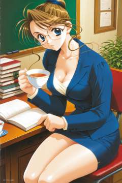 Kadoi Aya Style,Fumi Yokomizo,1girl,solo,glasses,blue eyes,brown hair,teacup,book,tea,cleavage,breasts,blue uniform,formal,suit,teacher,jacket,sitting,pencil skirt,<lora:Kadoi Aya_illustriousXL:0.8>,