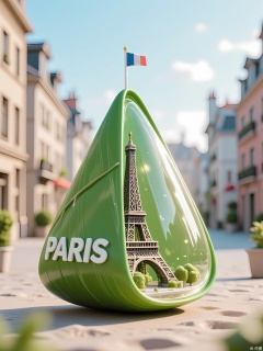 Photograph of a green, triangular-shaped container filled with a small, detailed 3D-printed model of the Eiffel Tower. The miniature structure includes latticework details and a tiny French flag at the top. The container rests on sandy terrain with blurred, pastel-colored apartment buildings and a gradient blue sky in the background. Soft natural light creates gentle shadows, with a shallow depth of field emphasizing the model’s precision.