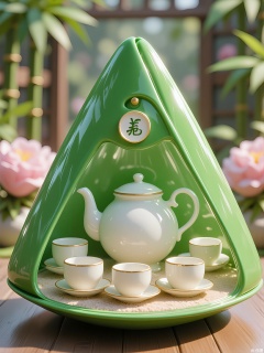 Photograph of a green, triangular-shaped container holding a miniature porcelain tea set, complete with a tiny teapot, cups, and saucers arranged on a sand-textured base. The background fades into a blurred garden of peonies and bamboo under soft midday light.