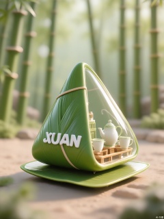 CYHB, Photograph of a green, triangular-shaped container holding a miniature porcelain tea set, complete with a tiny teapot, cups, and saucers arranged on a sand-textured base. The background fades into a blurred garden of peonies and bamboo under soft midday light.