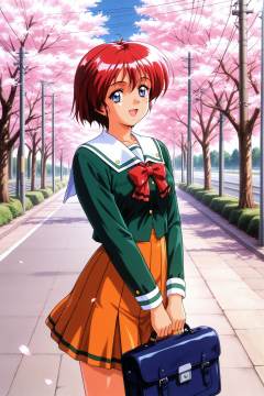Original Style,Hinomoto Hikari,1girl,mole under eye,solo,red hair,short hair,school uniform,blue eyes,skirt,outdoors,smile,orange skirt,road,bag,looking at viewer,day,holding,1990s \(style\),long sleeves,power lines,school bag,pleated skirt,holding bag,bow,tree,cherry blossoms,open mouth,white sailor collar,<lora:Tokimeki Memorial 2_illustriousXL_v2:0.9>,