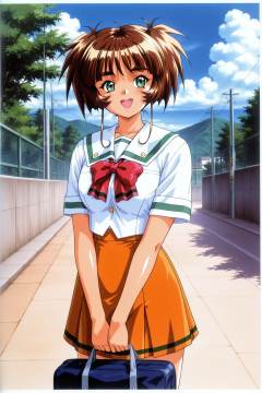 Original Style,Ichimonji Akane,1girl,solo,school uniform,brown hair,skirt,green eyes,orange skirt,short hair,day,outdoors,open mouth,school bag,smile,sky,bow,cloud,short sleeves,holding,<lora:Tokimeki Memorial 2_illustriousXL_v2:1>,