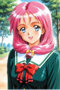 Original Style,Shirayuki Miho,1girl,solo,blue eyes,pink hair,school uniform,open mouth,smile,retro artstyle,hair over shoulder,1990s \(style\),long hair,looking at viewer,ribbon,bow,upper body,green shirt,:d,outdoors,<lora:Tokimeki Memorial 2_illustriousXL_v2:1>,