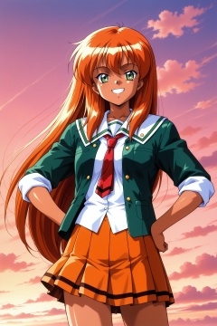 Original Style,Akai Homura,1girl,long hair,green eyes,solo,skirt,smile,school uniform,necktie,orange hair,very long hair,hands on own hips,green jacket,jacket,grin,looking at viewer,shirt,red necktie,sky,orange skirt,standing,cloud,open clothes,pleated skirt,white shirt,sleeves rolled up,open jacket,cowboy shot,outdoors,long sleeves,1990s \(style\),<lora:Tokimeki Memorial 2_illustriousXL_v2:1>,