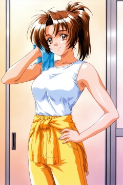 Original Style,Kudanshita Maeka,1girl,solo,brown hair,1990s \(style\),towel,clothes around waist,hand on own hip,retro artstyle,brown eyes,smile,standing,ponytail,shirt,looking at viewer,high ponytail,pants,yellow pants,white shirt,sleeveless,upper body,<lora:Tokimeki Memorial 2_illustriousXL_v2:1>,