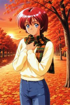Original Style,Hinomoto Hikari,1girl,solo,mole under eye,1990s \(style\),red hair,retro artstyle,short hair,blue eyes,sweater,smile,pants,long sleeves,in autumn,maple leaf,sunset,kaza,hands on own chest,scarf,<lora:Tokimeki Memorial 2_illustriousXL_v2:1>,