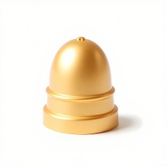 A highly detailed, realistic CGI depiction of a tiny, golden thimble with a shiny, seamless surface. The thimble has a slight flare at the top and a series of small, evenly spaced indentations around its body. Placed on a pure white background, the gold thimble catches the light, highlighting its curves and the craftsmanship involved in its creation. The image has a clean, uncluttered aesthetic.