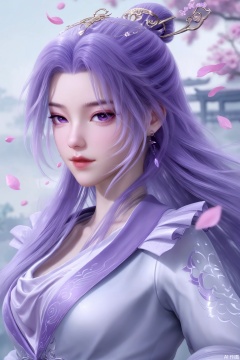 1girl, solo, long hair, hair ornament,looking at viewer, dress, jewelry, purple eyes, upper body, purple hair, earrings, petals, chinese clothes, falling petals,