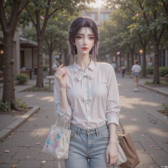 zichu-tms-yx, a 22-year-old young girl, casually tied her long dark purple hair into a low ponytail, and a few strands of hair fell down beside her cheeks, adding a bit of laziness. Her makeup is fresh and natural, and she only applied a light pink lip gloss and waterproof mascara, making her look purer and more cute. She was wearing a loose white cotton shirt with a bow-shaped neckline, adding a touch of sweetness; the cuffs were puff sleeves, which looked playful and cute. The hem of the shirt was stuffed into a pair of light blue high-waisted wide-leg jeans. The legs of the jeans were very long and dragged to the ground, creating a natural wrinkle. She paired it with a pair of white thick-soled sneakers with colorful graffiti patterns on the upper to show personality and fashion. A brown canvas backpack was carried on her shoulders, with some metallic decoration on the bag, adding to the texture of the backpack. She held a book in her hand and walked on the tree-lined path on campus. The sun shone on her through the gaps of the leaves, creating a warm and beautiful atmosphere.