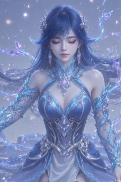1 girl, Upper body, black hair,solo, blue hair, closed eyes, lying down, pillow, sleeping,A light blue off-shoulder top with an irregular dust-drifting shape with silver thread outlined edges. There is a transparent tulle connection on the shoulders, and the tulle is embroidered with a small dust particle pattern, revealing the skin loomingly. The main fabric of the top is made of shiny silk, with mysterious dust runes embroidered with blue and purple silk threads, symbolizing the dusty power obtained by Sisi. It is paired with a multi-layered blue gradient skirt, which changes from light blue to dark blue, like the different colors of dust appearing in the light. The hem of the skirt is irregularly jagged, like the edge of dust blown by the wind. The outer layer of the skirt is a thin layer of gauze, spreading silver sequins, which simulate the effect of dust flashing. The inner layer is soft silk, which is comfortable to wear. A silver belt is tied around her waist, and blue gems are inlaid on the belt, which echoes the top. The original long blue hair becomes thicker and smoother, and the ends are slightly curled, as if it is stained with a mysterious color by dust. The hair is worn with a silver crown, which is inlaid with blue and purple gems, forming a dust swirl. Two blue ribbons were hanging from both sides of the hair crown, with silver dusty patterns embroidered on the ribbons. They fluttered as the hair swung, and the skin became whiter and brighter, as if covered by a faint layer of dust. The eyes were deep blue, and there was a purple light flashing in the eyes, like the mysterious power surging in the dust. The eye makeup uses blue and purple eyeshadows to outline the deep eye sockets, making the eyes more charming. The lips were painted in a lilac color, and the slightly raised corners of the mouth were filled with a mysterious smile. There is a silver dust mark on the middle of the eyebrows, which is a symbol of dusty power. A pair of blue high heels, the heel is made of transparent crystal material, and there are flowing silver dust particles inside, as if sealing the power of dust in it. The upper is made of blue leather and is set with blue and silver gemstones to form the pattern of dust flowers. There is a purple gem at the tip of the shoe, shining with a mysterious light. There is a silver ribbon on the ankle, tied into a bow, adding to the exquisiteness of the shoes