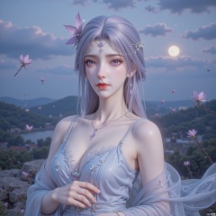 zichu-tms-yx, The image depicts a serene and ethereal scene with a female character in the foreground. She has long, flowing silver hair adorned with delicate jewelry, including a headpiece with a purple leaf and a necklace with a purple gemstone. Her attire is elegant, featuring a light blue dress with intricate embroidery and a sheer shawl draped over her shoulders. The background showcases a picturesque landscape with mountains, a lake, and a sky filled with soft clouds and a full moon. Floating pink flowers are scattered throughout the scene, adding to the tranquil and magical atmosphere.