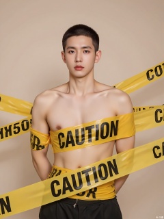 A young man with a buzz cut and a lean physique stands against a plain beige backdrop. He is unclad, yellow caution tape wound around him, the words "CAUTION" and "DANGER" prominent. His face is calm, looking straight at the camera. The lighting is even, giving a sense of balance.