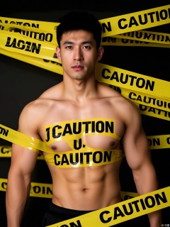 JDKB, A man with a muscular build stands against a black background. He is unclad, with yellow caution tape around him, the words "CAUTION" and "DANGER" on it. His stance is confident, looking at the camera. The lighting is high - contrast, emphasizing the tape.