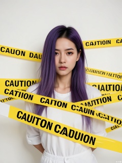 JDKB, An androgynous individual with long, flowing purple hair stands against a clean white wall. They are unadorned except for yellow caution tape wrapped around them, bearing the words "CAUTION" and "DANGER". Their face is expressionless, looking directly at the camera. The lighting is soft yet focused.