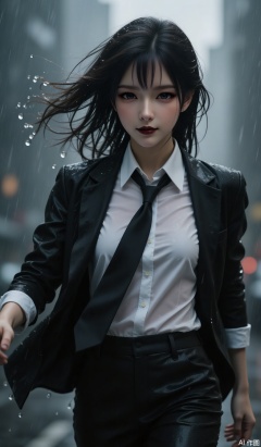 1girl, solo, looking at viewer, shirt, black hair, long sleeves, jacket, white shirt, outdoors, open clothes, necktie, collared shirt, pants, blurry, black eyes, open jacket, lips, black jacket, wet, depth of field, blurry background, black pants, formal, suit, wet clothes, black necktie, sleeves rolled up, rain, motion blur, realistic, red lips, shirt tucked in, wet shirt