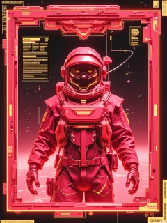 SBPK, A digital piece depicting a close-up of a face inside a glowing ruby frame. The face is illuminated by a deep, red glow, standing out against the dark, futuristic space station. The person dons a spacesuit with integrated tech and a holographic control panel, surrounded by floating data streams and stars. The artwork has a cyberpunk flair with neon highlights and a vast, cosmic vibe.