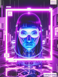 SBPK, A close-up portrait of a cybernetically augmented woman with biomechanical facial tattoos inside a pulsating magenta frame. Her mechanical eye glows cobalt blue against a rain-soaked alleyway backdrop filled with flickering holographic advertisements.