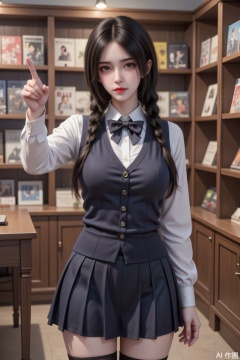 Masterpiece, the best quality, high quality, huge breasts,,(black hair:1.4),(long legs:1.3),(thin legs:1.4),a girl is standing, shelves with magazines, eyefish, twin braids, school uniform,open mouth, sweat, nervous smile, black hair, bangs, large breasts, glasses, thighhighs, bowtie, sweater vest, skirt, full body, long hair, hatching \(texture\), looking at viewer, pov, dutch angle, pointing at self,