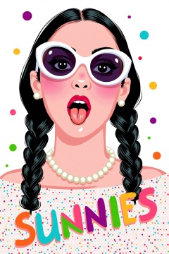 A vibrant digital illustration of a stylized woman with exaggerated features,large white sunglasses,and a pearl necklace. She has long,braided black hair,a pink complexion,and a playful expression with her tongue out. The background is white with colorful polka dots and the word "SUNNIES" in bold,colorful letters,