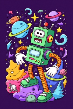 A vibrant,colorful digital illustration featuring a whimsical,cartoonish robot with a green body,orange limbs,and white gloves,surrounded by a chaotic array of planets,spaceships,and comets in a cosmic setting. The background is a deep purple with stars and sparkles,creating a playful,surreal atmosphere,
