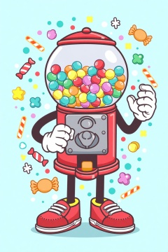 A vibrant digital cartoon illustration features a whimsical,anthropomorphic gumball machine with a round,gray body,red shoes,and white gloves. The machine has a large,colorful gumball dispenser,with gumballs,candy canes,and stars floating around. The background is a light blue with playful,abstract patterns,