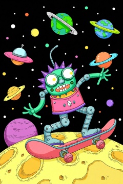 A vibrant,cartoon-style digital drawing depicts a green-skinned,robotic humanoid with a spiked collar and goggles skateboarding on a moon with a cratered surface. Surrounding them are colorful spaceships,planets,and a black starry sky. The scene is playful and whimsical,with exaggerated,colorful details and a retro-futuristic aesthetic,