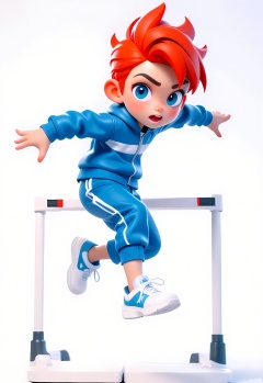 A 3D CGI of a young athlete with short, spiky red hair, wearing a blue track suit with white stripes on the sides, white running shoes. He jumps over an imaginary hurdle, looking at the viewer with a determined look. The background is white. The style is sporty and cartoonish, but more emphasis on the motion blur could add realism.