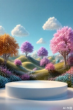 background  A vibrant digital illustration depicts a whimsical, surreal landscape with rolling hills and colorful trees in shades of pink, purple, and orange. A white circular platform stands in the foreground. The sky is a clear blue with fluffy white clouds. The scene exudes a dreamy, fantastical atmosphere.