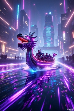 Cyberpunk style A vibrant, neon-lit digital artwork depicting a dragon-headed boat racing through a futuristic cityscape. The boat, adorned with glowing purple accents, is crewed by armored figures. Neon lights and holographic billboards illuminate the background, reflecting off the water. The scene is dynamic and cyberpunk-inspired, with a sleek, high-tech aesthetic.