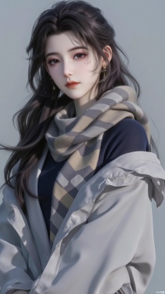 lxq.1girl, Anime,This is a digital illustration featuring a young person with a pale, almost ethereal complexion, and long, voluminous, wavy black hair that cascades around their shoulders. Their facial features are delicate, with high cheekbones, a small nose, and full, slightly parted lips. They have large, expressive eyes that are a deep, intense brown. The person is dressed in a large, light gray overcoat that falls to their knees, giving a cozy, winter vibe. Underneath, they wear a dark-colored top, possibly a sweater or shirt. Wrapped around their neck is a thick, patterned scarf in shades of gray and beige, adding a touch of warmth and texture to the outfit. The background is a soft, muted gray, blending seamlessly with the person's attire and enhancing the overall somber, serene atmosphere. The image is highly detailed and realistic, with a soft, almost dreamlike quality to the lighting and textures. The overall style of the illustration is modern, with a focus on realism and intricate details, making it a captivating and immersive piece of art.