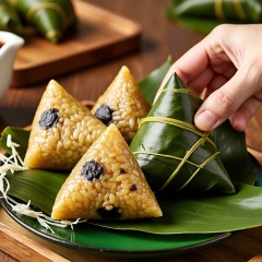 zongzi,zonzi,A delicious food is Glutinous rice cakes wrapped in banana leaves. Glutinous rice cakes is triangular in shape, with some black dots on the surface, which may be sesame or other ingredients. Glutinous rice cakes is tightly wrapped in banana leaves. The color of banana leaves is green, and there are some white fibers on the surface. Glutinous rice cakes is placed on a green plate with some grains on the edge. One hand is holding a Glutinous rice cakes. The hand is in the upper right corner of the picture, and the finger is holding a corner of the banana leaf. The background is a wooden tabletop, on which there are some other foods, maybe other Glutinous rice cakes or other snacks. The overall visual style is realism, with bright lighting and a warm atmosphere.
