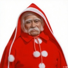 looking at viewer,christmas,hat,red jacket,male focus,face,mustache,old man,red hood,red capelet,red cape,red gloves,christmas ornaments,bell,white hair,red cloak,santa hat,santa costume,merry christmas