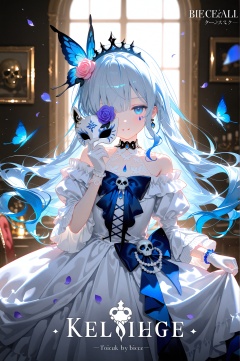 masterpiece,best quality,high quality,loli,chromatic_aberration,//,loli,1girl,flower,dress,blue hair,album cover,dress flower,rose,blue eyes,mask,hair flower,cover,long hair,hair ornament,white dress,white rose,holding mask,white flower,blue flower,butterfly,solo,eye mask,blue rose,bug,crown,song name,smile,jewelry,gown,looking at viewer,skirt hold,cover page,frilled dress,off-shoulder dress,frills,bare shoulders,flower over eye,blue butterfly,holding,light blue hair,earrings,sparkle,bow,skull,indoors,parted lips,petals,detached sleeves,blue bow,dress bow,half mask,mirror,off shoulder,puffy sleeves,one eye covered,long sleeves,very long hair,tiara,skull mask,unworn mask,wavy hair,choker,purple rose,animal head,picture frame,utaite,juliet sleeves,blue ribbon,feathers,ribbon,bracelet,chair,cross-laced clothes,falling petals,long dress,facial mark,princess,white sleeves,pink rose,teardrop facial mark,flower brooch,novel cover,standing,flower earrings,card,copyright name,pearl bracelet,pink flower,white mask,clothes lift,tattoo,cape,knight,hand up,closed mouth,layered dress,lolita fashion,butterfly hair ornament,purple flower,cross-laced dress,covering one eye,sidelocks,holding skull,halterneck,playing card,facial tattoo,purple butterfly,heart,wide sleeves,doujin cover,domino mask,eyepatch,bone,1other,floating hair,gloves,gem,//,year_2023,year_2024,year_2025,official art,depth of field,detailed light,blurry background,cinematic lighting,ray tracing,amazing quality,very aesthetic,absurdres,beast quality,ultra detailed,god rays,backlighting,photo background,film grain,chromatic aberration,volumetric lighting,depth of field,blurry background,shiny skin,cinematic lighting,day,very aesthetic,