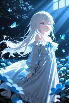 masterpiece,best quality,high quality,loli,chromatic_aberration,Blue Theme, //loli,night,gothic,long dress,1 girl,solo,long white hair,blue eyes,detailed eyes,blink and youll miss it detail,butterfly,flower garden,high quality,floral background,very detailed,off shoulder,//, official art,depth of field,detailed light,blurry background,cinematic lighting,ray tracing, ultra detailed,god rays,backlighting,photo background,film grain,chromatic aberration,volumetric lighting,depth of field,blurry background,shiny skin,floating hair,cinematic lighting,day,very aesthetic