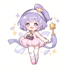 This cute chibi girl has short, lavender hair with a white headband, wearing a light-pink tutu and a white leotard. She's holding a small, gold trophy, her face glowing with pride. The simple white backdrop is filled with tiny silver stars and ribbons.