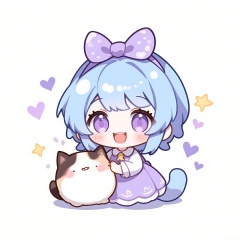 This cute chibi girl has short, bubblegum-blue hair, wearing a light-purple dress with a white collar and a purple bow. She holds a small, white kitten with purple eyes, a big smile on her face. The plain white backdrop is filled with tiny pastel hearts and stars.