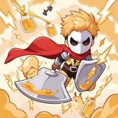 QMXR, An endearing chibi boy with fluffy, honey-blond hair, dressed in a bright-red superhero cape and a white mask. He holds a small, silver shield, his chest puffed out with pride. The simple white backdrop is filled with tiny yellow lightning bolts and clouds.