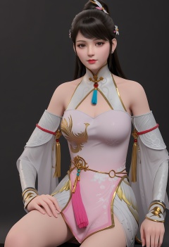 (perfect_anatomy:1.1),(upper_body:1.1),<lora:YQ_pony_cangyuegongzhu_V4:0.8>,q1528437228,1girl,solo,long hair,hair ornament,black hair,dress,jewelry,bare shoulders,chinese clothes,ponytail,white dress,detached sleeves,earrings,china dress,brown eyes,brown hair,realistic,breasts,clothing cutout,hair flower,lips,cleavage cutout,boots,hair bun,knee boots,white footwear,bracelet,makeup,red lips,swept bangs,see-through,pink dress,black eyes,sleeveless,(looking_at_viewer:1.1),perfect_anatomy BREAK perfect_anatomy,solo focus,(score_9:1.2),masterpiece,(best quality:1.1),(simple background,pure black background,black background:1.1),perfect_anatomy,