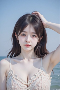 The image depicts a person with long, dark hair, wearing a white lace-adorned top. The individual is positioned against a blue sky background, with their head tilted slightly to the side, creating a relaxed and ethereal atmosphere. The person's hand is raised to their head, and their gaze is directed towards the camera, giving a sense of intimacy and connection. The overall composition and lighting suggest a serene and artistic setting.Ultra HD quality, photography, extreme_detailed, ultra_realistic.
