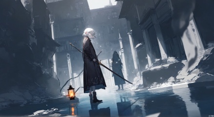 masterpiece, best quality, amazing quality, (roitz \( roitz \), au \(d elete\):1.1), (munlu \(wolupus\) ,banpai akira:1.2),high quality,artist_ciloranko,best quality,(masterpiece), artist's painting style: soresaki, (artist's painting style molu stranger),solo, short hair, holding, standing, weapon, white hair, male focus, sword, water, coat, building, scenery, reflection, lantern,Light, shadow