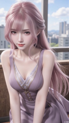 1girl, solo, sleeveless dress, looking at viewer, mischevious smile, perfect body, scenery, sharp focus, best quality, masterpiece, detailed outfit, illustration, perfect eyes, finely detailed beautiful anime eyes, realistic skin, intricate details, best lighting, depth of field, ultra high resolution, cowboy_shot