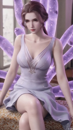 1girl, solo, sleeveless dress, looking at viewer, mischevious smile, perfect body, scenery, sharp focus, best quality, masterpiece, detailed outfit, illustration, perfect eyes, finely detailed beautiful anime eyes, realistic skin, intricate details, best lighting, depth of field, ultra high resolution, sitting