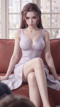 1girl, solo, sleeveless dress, looking at viewer, mischevious smile, perfect body, scenery, sharp focus, best quality, masterpiece, detailed outfit, illustration, perfect eyes, finely detailed beautiful anime eyes, realistic skin, intricate details, best lighting, depth of field, ultra high resolution, sitting