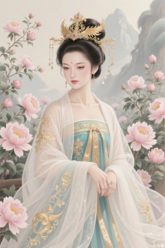 Ink and paint style, plump Yang Yuhuan hairpin hairpin, Phoenix crown and cloud-like robe,embroidered skirt leaning against peonies, eyebrows and eyes are filled with charm, background is smudged in ink and paint, the brushstrokes are intertwined with virtual and real, classic and elegant,srcq,fgxp