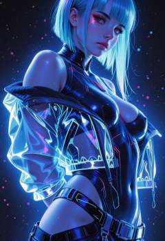 1girl, detailed eyes, (pretty face), (detailed face), (slender, lean, fit, athletic:1.5), rating_explicit, rating_nsfw, (sexy), defined midriff, skindentations, medium breasts, (perfect body:2), photo-realistic, realistic skin, realistic textures, detailed skin, photorealistic, ultrarealistic, 8k, impossible clothing, hypersexualized, mature themes, inappropriate content, vulgar, obscene, nsfw, explicit, ***** content, erotic, suggestive, intimate, provocative, A digital illustration shoot from a profile camera angle about a stylized character with blue neon lighting, wearing a futuristic outfit. the image also shows a confident and serious expression on the subject. on the middle of the image, a 1woman, who appears to be in her mid-twenties, with long, straight blue hair and bangs, is standing with her arms crossed. she has red eyes and a serious expression. she is wearing a black, futuristic outfit with a high collar and short sleeves, and has a belt around her waist. her body is slim, and she has medium-sized breasts. the background is a dark blue gradient with glowing blue lines, giving the image a futuristic and cyberpunk aesthetic. 1girl, solo, character:lucy (cyberpunk), rating:sensitive, jacket, breasts, looking at viewer, leotard, medium breasts, short hair, hip vent, open clothes, cropped jacket, off shoulder, open jacket, belt, cyberpunk, blunt bangs, eyeliner, makeup, bare shoulders, score_9, score_8_up, score_7_up, <lora:r-hrtdrp:1>, <lora:DetailerILv2:1>, Jeddtl02