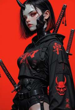 1girl, detailed eyes, (pretty face), (detailed face), (slender, lean, fit, athletic:2), rating_explicit, rating_nsfw, (sexy), defined midriff, skindentations, medium breasts, (perfect body:2), photo-realistic, realistic skin, realistic textures, detailed skin, photorealistic, ultrarealistic, 8k, impossible clothing, hypersexualized, mature themes, inappropriate content, vulgar, obscene, nsfw, explicit, ***** content, erotic, suggestive, intimate, provocative, A digital illustration shoot from a portrait camera angle about a cyberpunk character with a futuristic, cybernetic appearance, standing confidently against a solid red background. the image also shows a woman with pale skin, short black hair, and red eyes, wearing a black kimono with red patterns and intricate designs, holding two katana swords in her right hand. she has a slender physique and is standing in the middle of the image, looking directly at the viewer with a serious expression. her hair is styled in a short bob cut, and she has small horns on her head. her eyes are a striking red color, and her face is adorned with a metallic, intricate design that resembles a cyborg-like humanoid figure. she is also wearing a katana on her back, which adds to her cyberpunk aesthetic. the overall aesthetic is dark and edgy, with a focus on the intricate details of her cybernetic features and the bold red background that complements her striking appearance. 1girl, red background, red eyes, solo, weapon, horns, sword, black hair, katana, looking at viewer, hood, simple background, mask, short hair, sheath, cyberpunk, sheathed, single horn, hood down, armor, rating:sensitive, long sleeves, rating:general, upper body, red theme, breasts, closed mouth, oni mask, lips, belt, hoodie, red hair, score_9, score_8_up, score_7_up, <lora:Sinozick_style:0.8> Sinozick_illu,gradient,spot color, <lora:r-hrtdrp:.5>, <lora:DetailerILv2:.5>, Jeddtl02