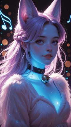 masterpiece, detailed_eyes, high_quality, best_quality, highres, subject_focus, depth_of_field, complementary colors,1woman, hair_over_eye, bangs, half_updo, freckles, (neon), glowing skin, french_braid, fox_ears, fluffy_dress, choker, (bell_collar), parted_lips, face_focus, full_body_view, soft_angle, radiant_expression, gentle_smile,dreamy, soft_bokeh_effect, natural, gentle_breeze_effect, moody, delicate_light_particles, vintage, inspired, soft, floating music, music notes, purple,black_background,
