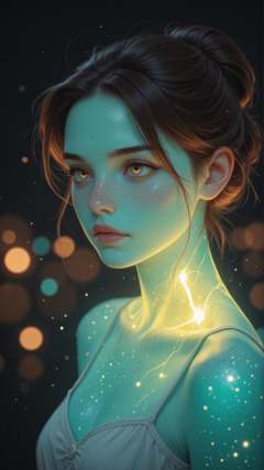 masterpiece, detailed_eyes, high_quality, best_quality, highres, subject_focus, depth_of_field, complementary colors,1woman, hair_over_eye, bangs, half_updo, freckles, (neon), glowing skin,face_focus, full_body_view, soft_angle, radiant_expression, dreamy, soft_bokeh_effect, natural, gentle_breeze_effect, moody, delicate_light_particles, vintage, inspired, soft, black_background,